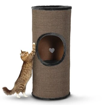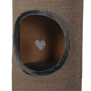 Die robuste Kratztonne mit Spielherz und gepolsterten Liegeflächen zum Ausruhen, Schlafen und Spielen.