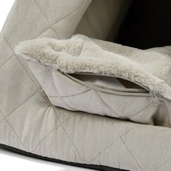 Praktisch ist das herausnehmbare Wendekissen. Durch die verschiedenen Stoffe des Liegekissens kannst du individuell entscheiden, welche Oberfläche dein Liebling und du bevorzugen – die Seite mit Steppung oder das kuschelweiche, hellgraue Langhaarplüsch.